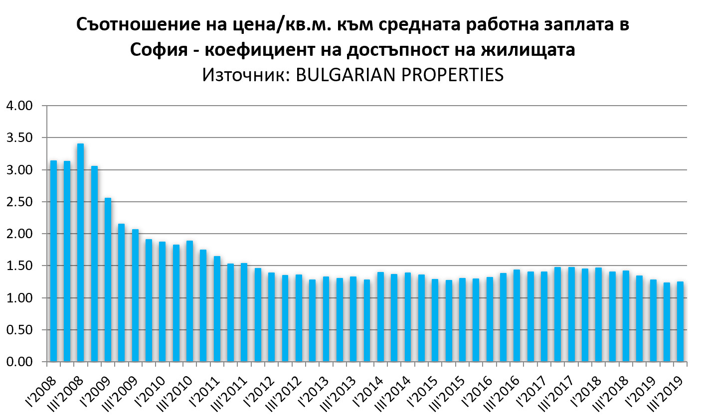 За третото тримесечие на 2019 г. стойността му е 1.25, което означава, че са нужни 1.25 средни софийски заплати за покупката на 1 кв.м. През 2019 г. измерваме най-ниската стойност на този показател за последните 10 години, следователно през тази година имотите в София са най-достъпни за купувачите. Това се дължи едновременно на забавянето на ръста на цените и на продължаващо нарастване на доходите, което за София е около 13% на годишна баз.