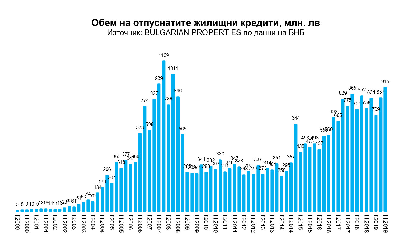 Обемите на новоотпуснатите жилищни кредити продължават да нарастват и през 3-тото тримесечие достигнаха над 900 млн. лв., което е сравнимо с показателите от 2007/2008 г. Но към момента икономическата ситуация е много по-различна, брутният вътрешен продукт е значително по-голям и като дял от него новоотпуснатите жилищни кредити са под 3%, докато през 2007/2008 обемът им надвишаваше 6% от БВП.