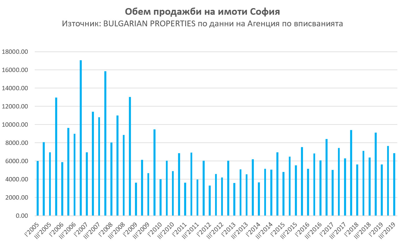 Според данните на Агенцията по вписванията през 3-тото тримесечие на 2019 г. в София са вписани 6 874 имотни продажби при 6 376 за същия период на 2018 г., което е ръст с около 8% на годишна база.