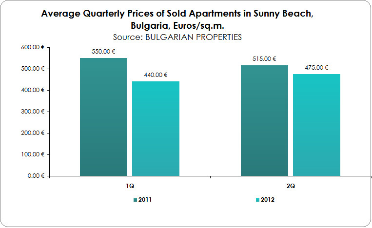 According to BULGARIAN PROPERTIES’ data the average listing price of apartments in Sunny Beach in 2Q was 740 EUR/sq.m. and deals were concluded at an average of 475 EUR/sq.m. (compared to 440 EUR/sq.m. in 1Q 2012). In the last few months the market in Sunny Beach follows a positive price trend based both on listing and sale prices which shows the beginning of a recovery. However, prices there are still lower compared to last year.
