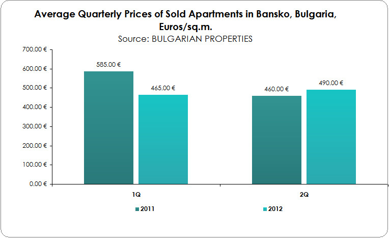 According to BULGARIAN PROPERTIES’ data the average listing price of apartments in Bansko in 2Q was 574 EUR/sq.m. (no change compared to the previous quarter) and deals were concluded at an average price of 490 EUR/sq.m. (compared to 465 EUR/sq.m. in 1Q 2012).