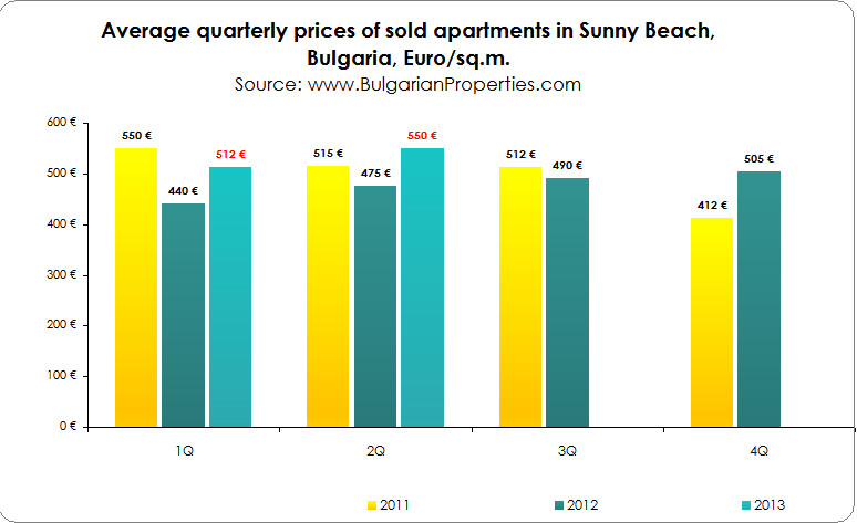 According to the BULGARIAN PROPERTIES data, the average price of apartments sold in Sunny Beach is 550 EUR/sq.m. in the second quarter of 2013, compared to 475 EUR/sq.m. for the same period of 2012 and 512 EUR/sq.m. in the first quarter of 2013.
