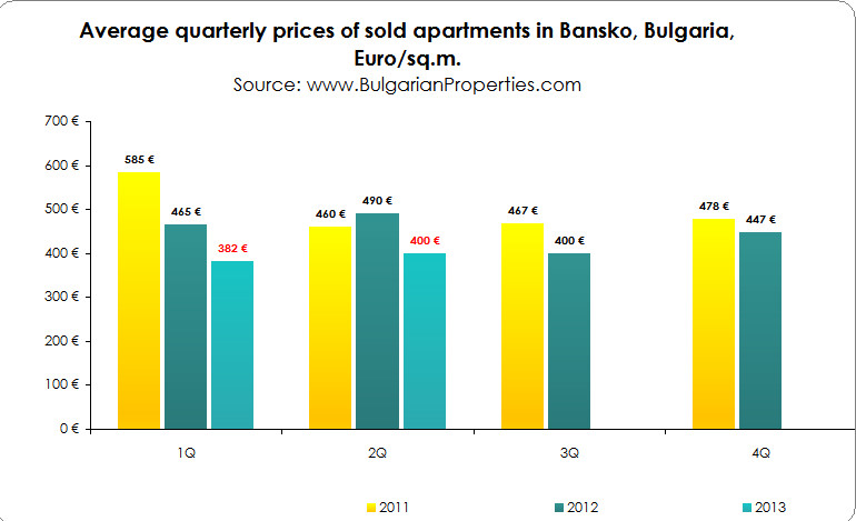 The average price of apartments sold in Bansko in 2Q of 2013, according to the BULGARIAN PROPERTIES data, is 400 EUR/sq.m., an increase of 4.7% in comparison to the first quarter (382 EUR/sq.m.) and a decrease of 18% (490 EUR/ sq.m.) year-on-year. 100% of the buyers in Bansko this year have been Russians.
