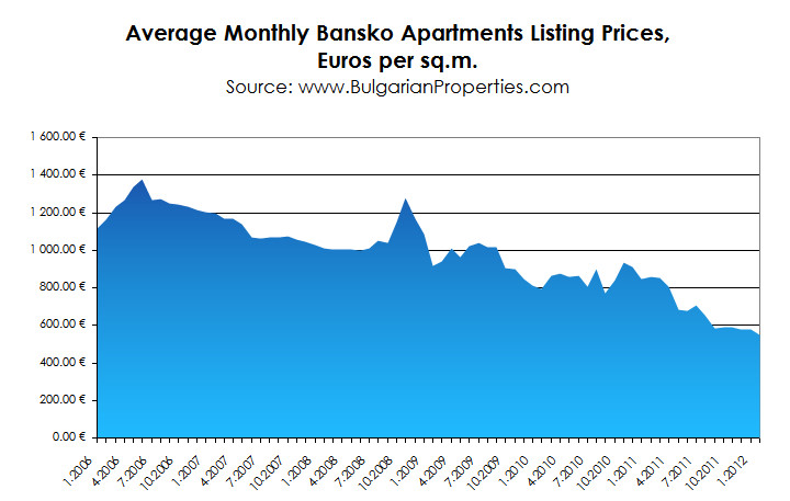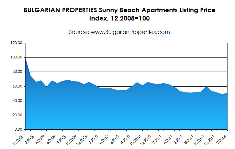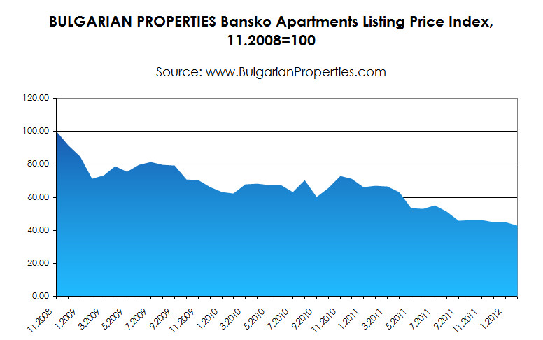 With BULGARIAN PROPERTIES index value for Sunny Beach and Bansko of 100 in November 2008, in February 2012 the index values were 56 and 43 respectively.