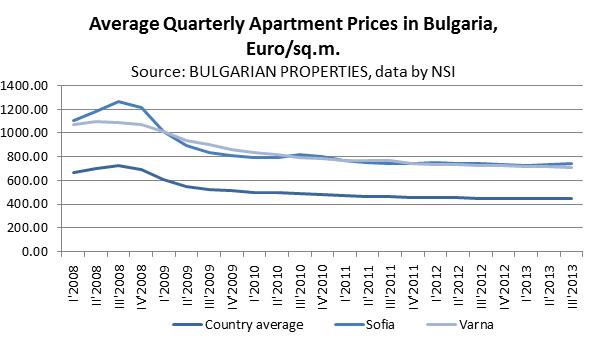 Nominally (without inflation deduction), property prices in Bulgaria remained almost unchanged compared to the previous quarter - a nominal decline of -0.15% on average for the country. On a yearly basis (compared to the third quarter of 2012) the prices in Bulgaria have decreased by -1.84%.