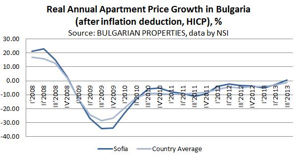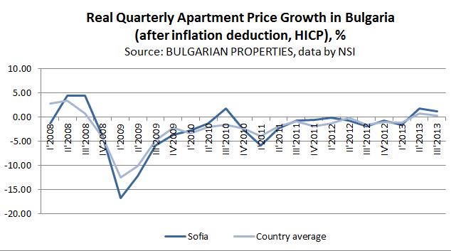 According to calculations of BULGARIAN PROPERTIES based on the data from the National Statistics Institute (NSI) about the prices of the apartments in the regional cities in Bulgaria in Q3 2013, housing prices in Bulgaria have achieved a successive real* quarterly growth (after deduction of inflation, calculated with the Harmonized Index of Consumer Prices, HICP).