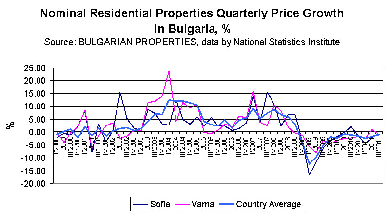 The latest data for apartment prices in the regional cities in Bulgaria, announced by the National Statistical Institute (NSI), shows that property prices continue to fall in the 3Q 2011, but that the drop is slowing down compared to previous periods.