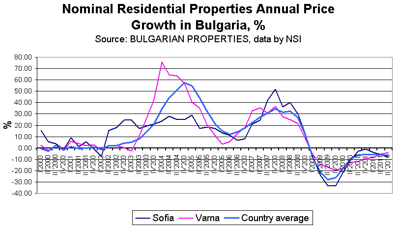 The accumulated nominal price decrease of apartments in the regional cities in the last 3 years is 36.45%, as according to NSI data the price drop in Sofia is 41%. The accumulated real decrease in prices since the beginning of the crisis is 40.8% on average for the country and 45.1% for Sofia.