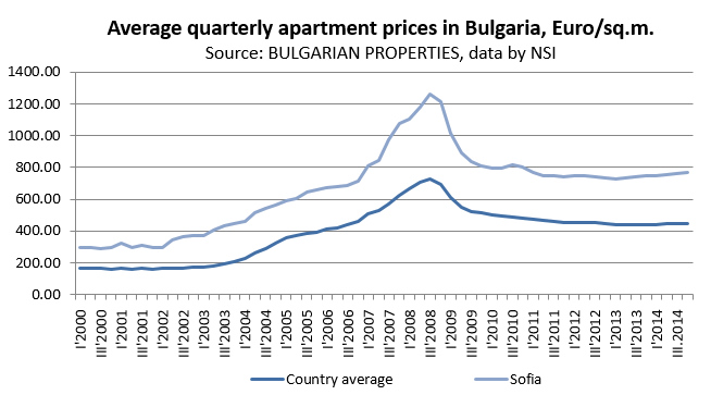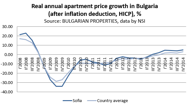 According to calculations by BULGARIAN PROPERTIES, based on the data from the National Statistics Institute about the apartments’ prices in the regional cities in Bulgaria, the property prices in the capital of Sofia registered nominal annual increase of +2.9% in 2014. For the country on average the nominal increase is +0.5%. After inflation deduction, the real* increase of property prices in Sofia for 2014 is +4.5%, and +2.1% for the country on average.