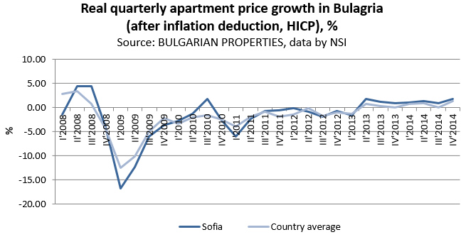 The property market in Sofia is developing more rapidly and is recovering faster than the markets in the other big cities, as the increase in property prices in the capital city accelerated during the last quarter of 2014. In Q4 in 2014 the average apartments’ prices in Sofia registered a real* annual increase (compared to Q4 of 2013) of +5%. Compared to the previous quarter, the registered increase in Sofia is +1.72%.