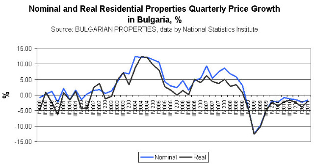The accumulated nominal price decrease compared to their peak value in 3Q 2008 is 36% (average for the country) while the percent for the capital Sofia is 40.66%. The accumulated real price decrease (after inflation) from their peak value until now is 40.27% on average for the country and 44.69% for Sofia.