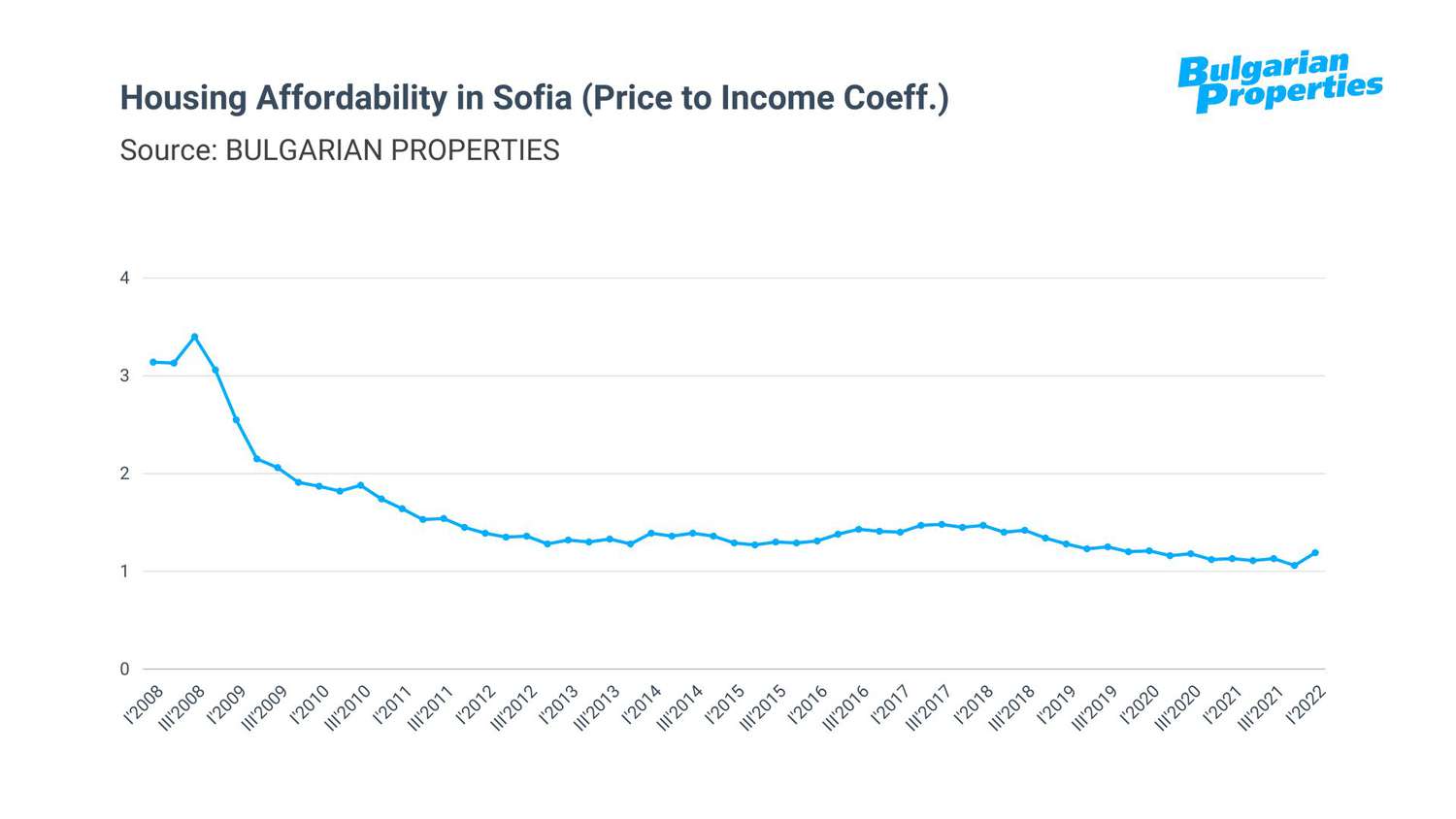 The affordability coefficient of BULGARIAN PROPERTIES in Q1 2022 is 1.19. Due to the faster growth of property prices than that of incomes in Sofia, which according to NSI data are growing by 12% on an annual basis, there is a certain increase in the value of the affordability coefficient.