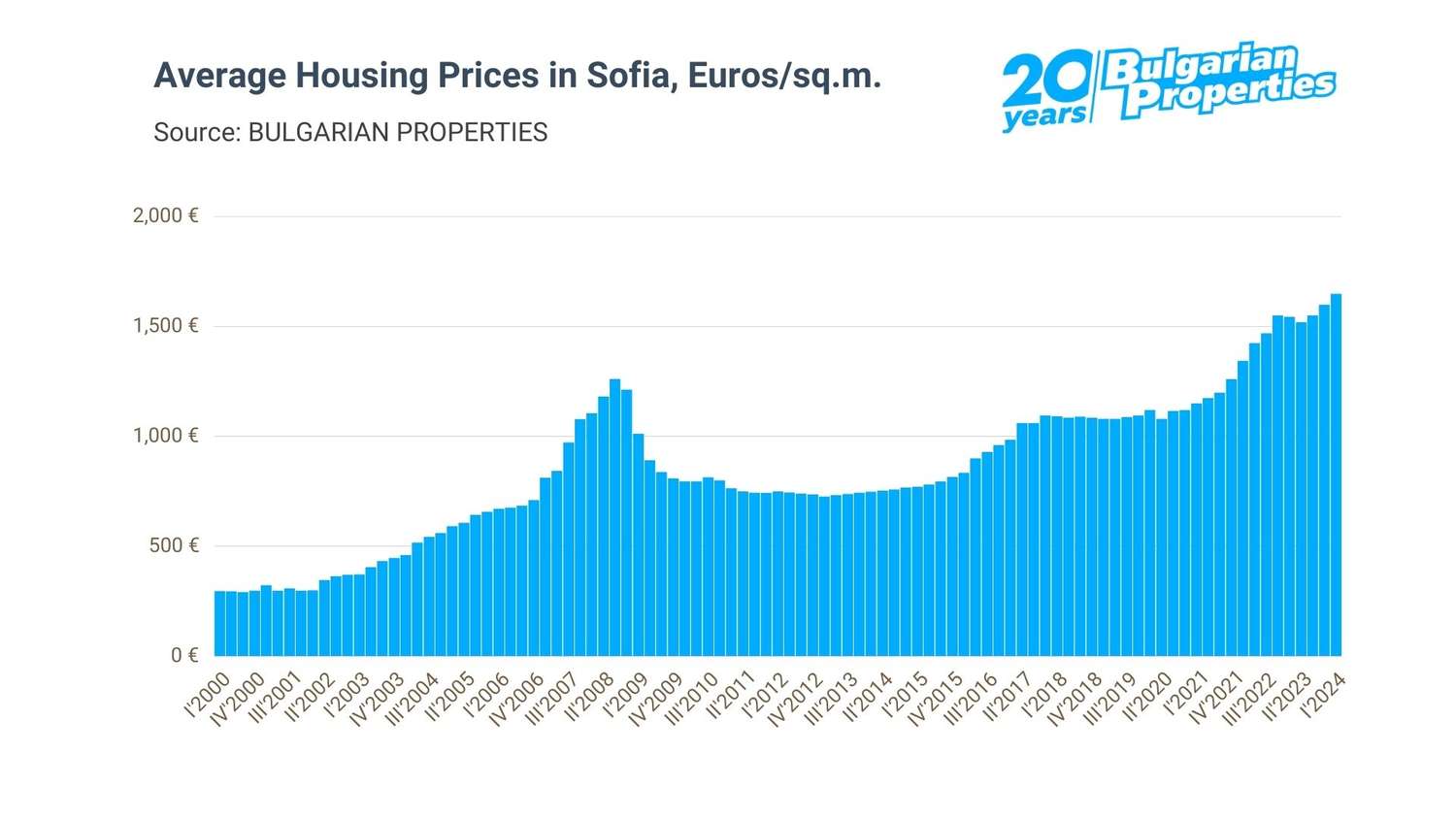 According to BULGARIAN PROPERTIES, the average price of homes purchased in the first quarter of 2024 in Sofia is EUR 1,650/sq.m., compared to EUR 1,545/sq.m. at the beginning of 2023. Thus, annual price growth in the Bulgarian capital accelerates nominally to 6.8% after a slowdown in late 2023.
