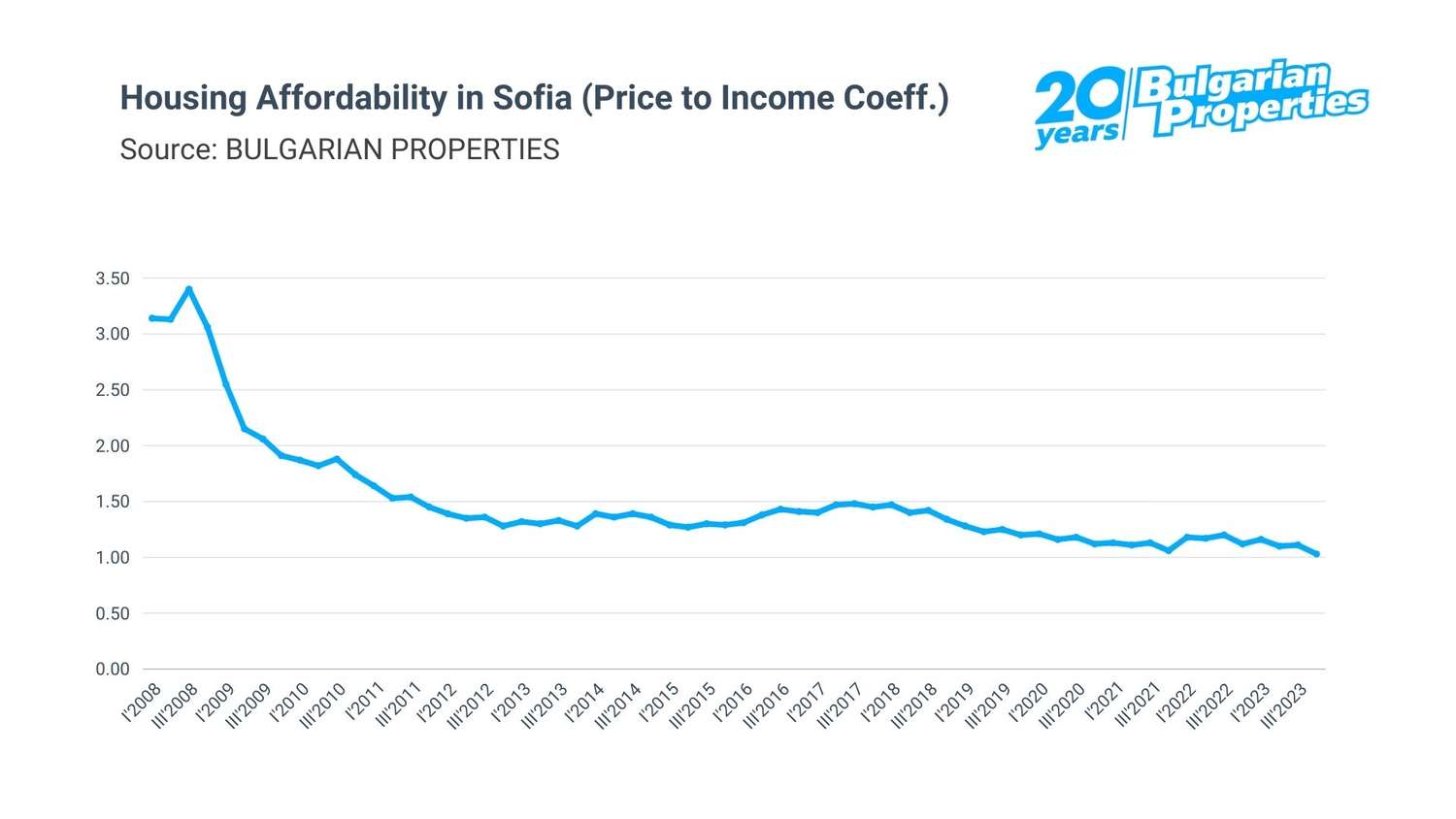 BULGARIAN PROPERTIES' affordability ratio value at the end of 2023 dropped to 1.03. This indicates that housing affordability in the Bulgarian capital has improved as incomes are rising faster than prices.