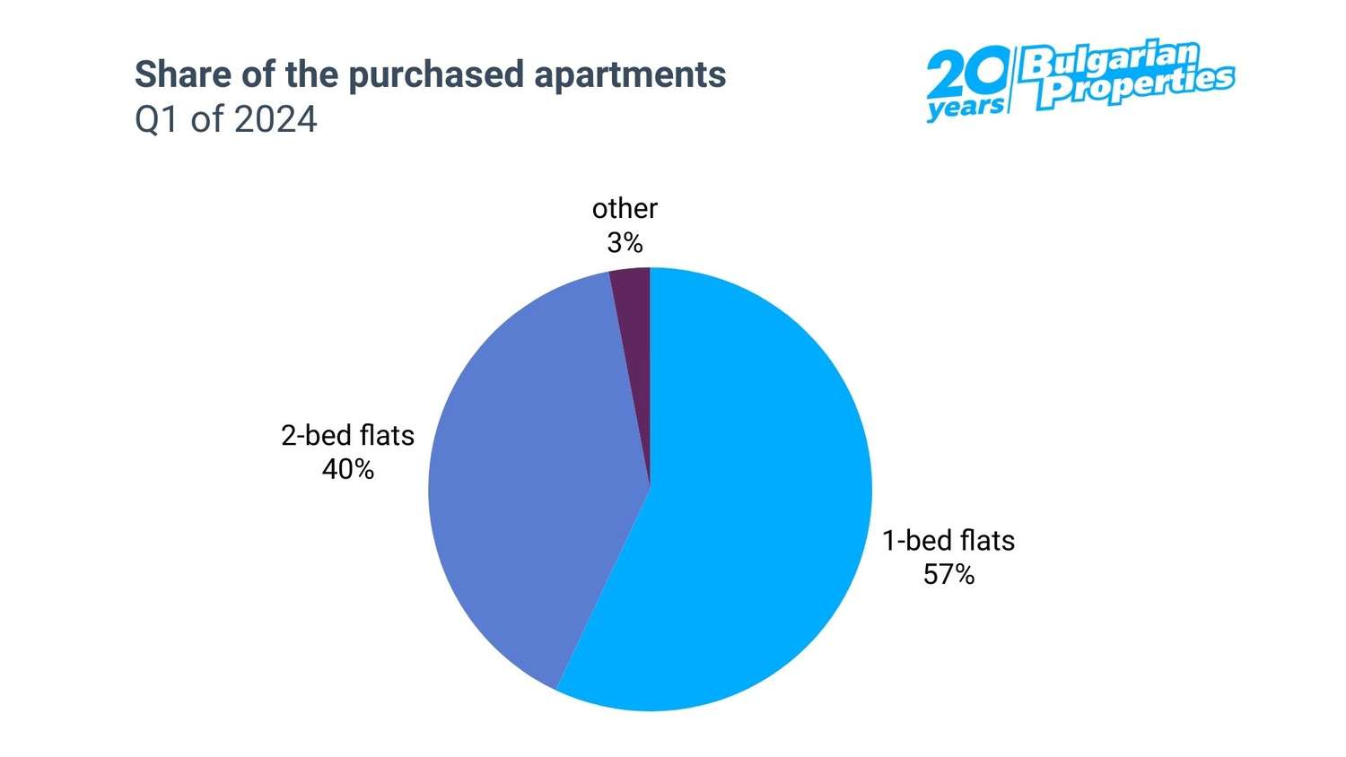 One- and two-bedroom apartments are the most sought after and dominate the market. The share of one-bedroom apartments purchased is 57% and that of two-bedroom apartments - 40%, which leaves almost no share for other larger or smaller apartments.