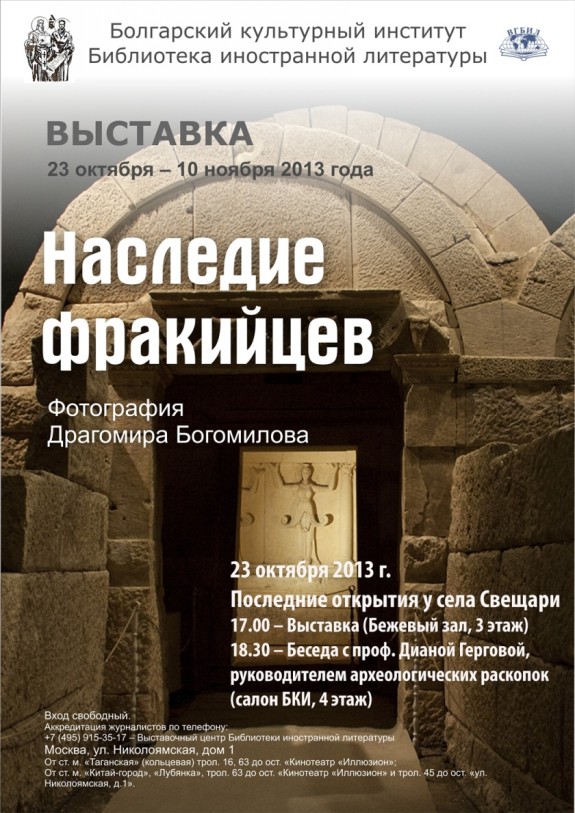 23 октября в московской Библиотеке иностранной литературы откроется фотовыставка «Наследие фракийцев». Увидеть авторские работы фотографа Драгомира Богомилова можно будет до 10 ноября. На них запечатлены находки, обнаруженные на территории историко-археологического заповедника «Сборяново» — царского некрополя, где насчитывается более 120 различных захоронений.