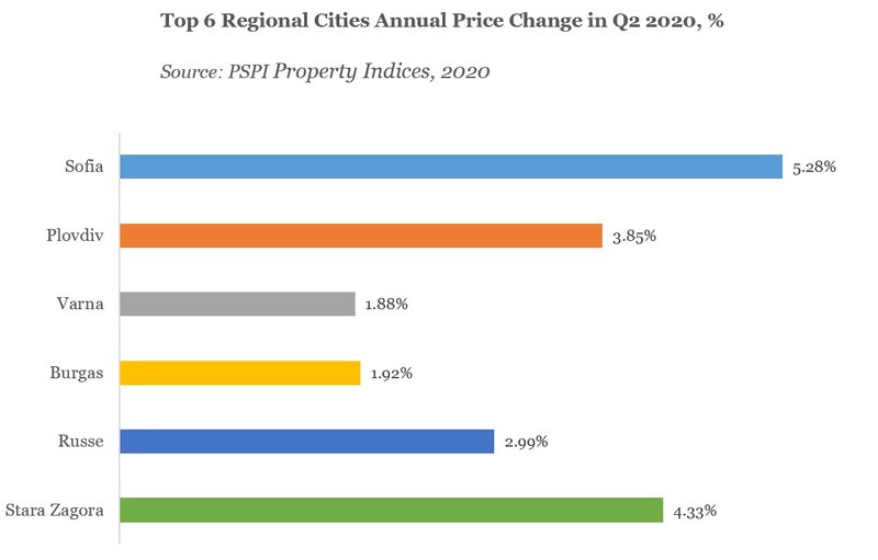 Анализът показва, че и през тази година цените на имотите продължават да растат, но с по-бавен темп. Към второто тримесечие цените на жилищата във всички областни градове се увеличават със средно 5.3%, в сравнение със 7.3% ръст, отчетен през същия период на 2019 г. и 7.0% през 2018 г.
