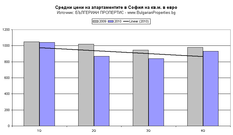 Съпоставяйки средната цена на кв.м. за 2010 (920 евро на кв.м.) спрямо тази от 2009 (998 евро на кв.м.) виждаме спад в цените с около 7.8%. И при средните цени от последните тримесечия на 2009 и 2010 г. се вижда лек спад в цените с 5% на годишна база.