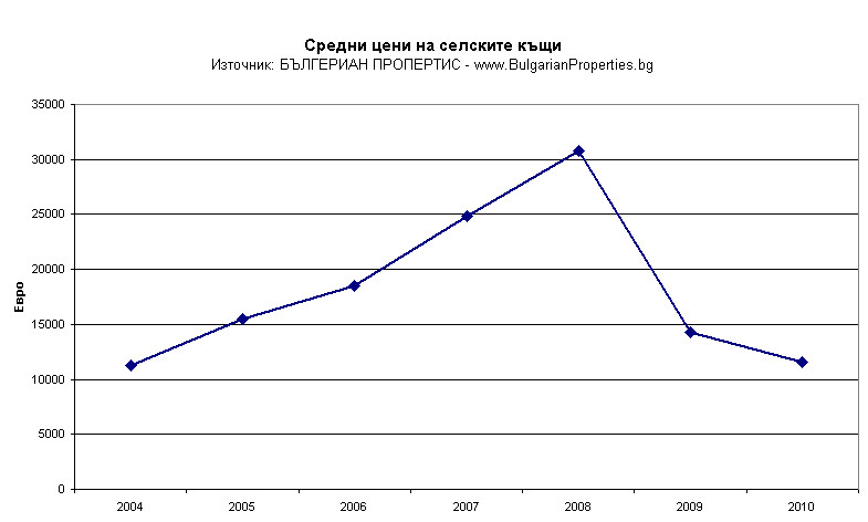 • 2010 г. – 11 600 евро -18.8% - през 2010 г. цените на селските имоти се върнаха на нива от 2004 г.