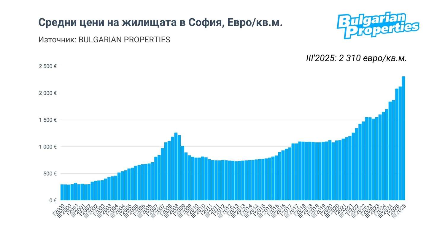 Средната цена на закупените жилища в София през третото тримесечие на 2025 г. достигна 2 310 евро/кв.м., показват данните на BULGARIAN PROPERTIES. Това представлява годишен ръст от 25.5%, равняващ се на нивата от 2022 г. – периода на най-високата инфлация.