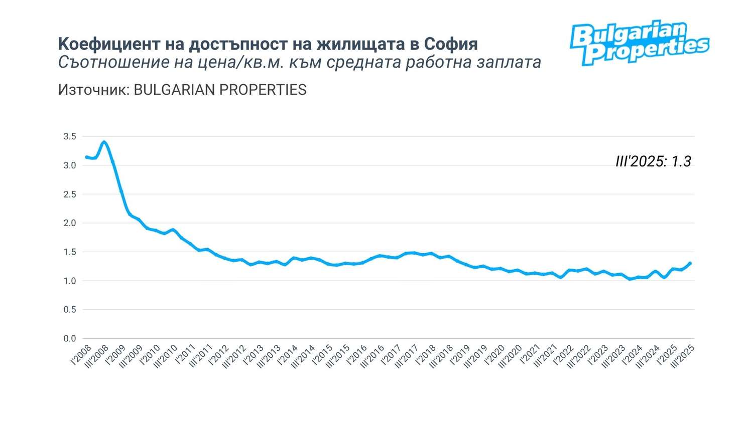 Коефициентът на достъпност, изчисляван от BULGARIAN PROPERTIES – показващ колко средни заплати са нужни за 1 кв.м жилищна площ – достига 1.3 за третото тримесечие.
