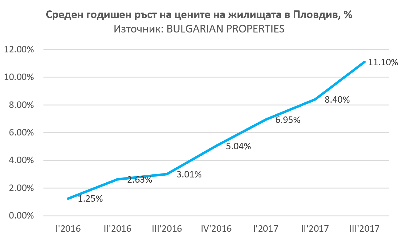 По-осезаемото нарастване на цените започна от края на 2016 г., като към 3-тото тримесечие на 2017 г. достигна 11% на годишна база по данни на BULGARIAN PROPERTIES. Средната офертна цена на жилищата в Пловдив е 650 евро/кв.м. за този период, като сделки се сключват дори на по-високи от средните цени - около 700 евро/кв.м., сочат още данните на компанията.
