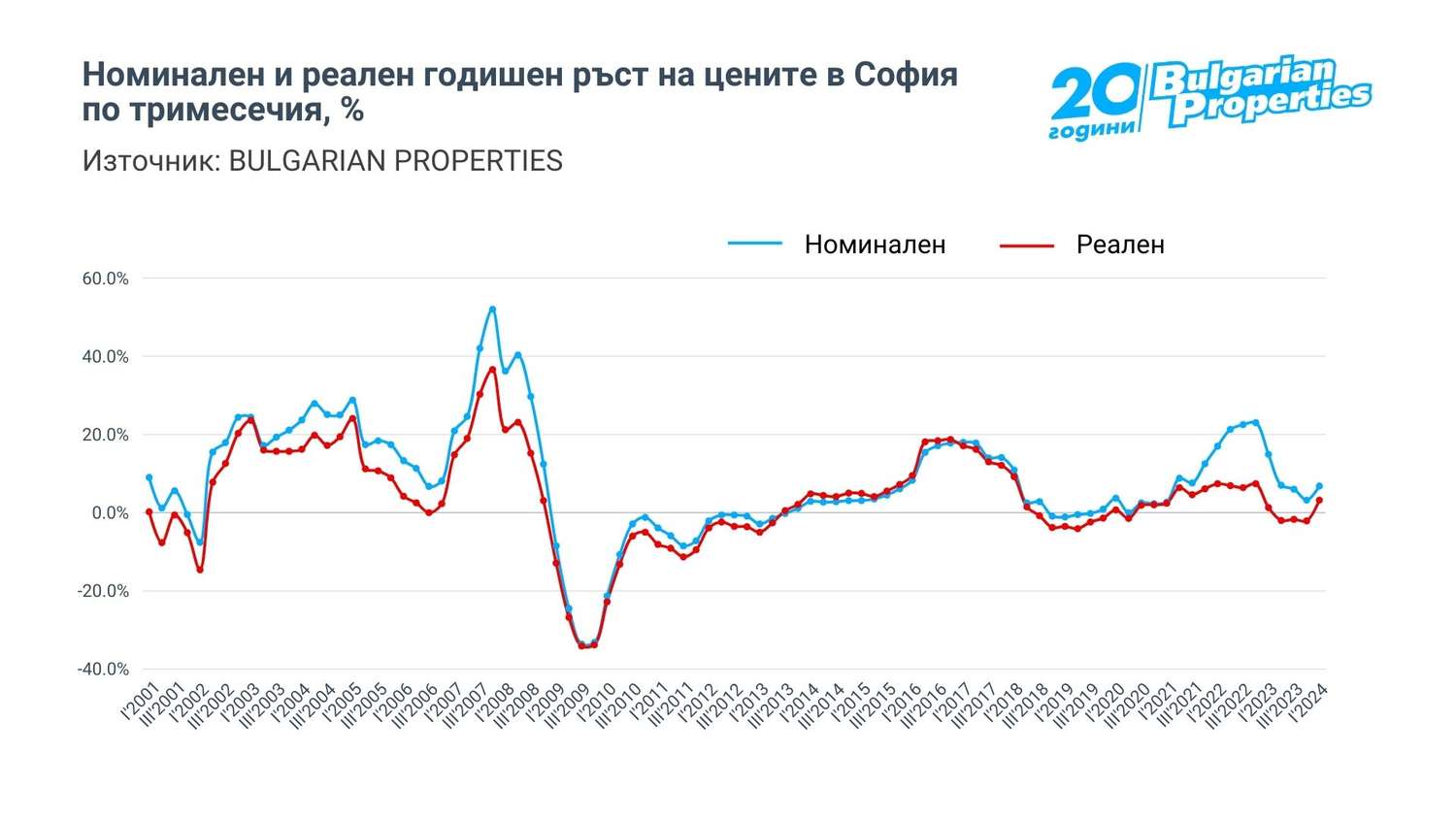 Същевременно, тази нова скорост допринесе за ускоряване на нарастването на цените след забавяне в края на 2023 г. Това се вижда най-ясно на водещия градски пазар София, където ръстът в края на 2023 г. беше около 3% на годишна база, а 2024 г. стартира с ръст от близо 7%.