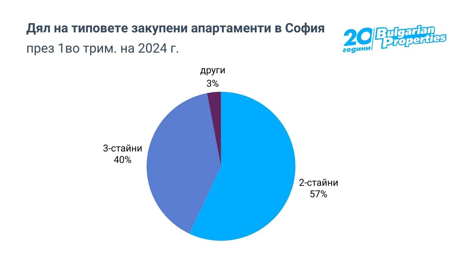 Двустайните и тристайните апартаменти са най-търсени и доминират пазара. Делът на закупените двустайни апартаменти е 57%, а на тристайните – 40%, което почти не остава дял на други по-големи или по-малки апартаменти.