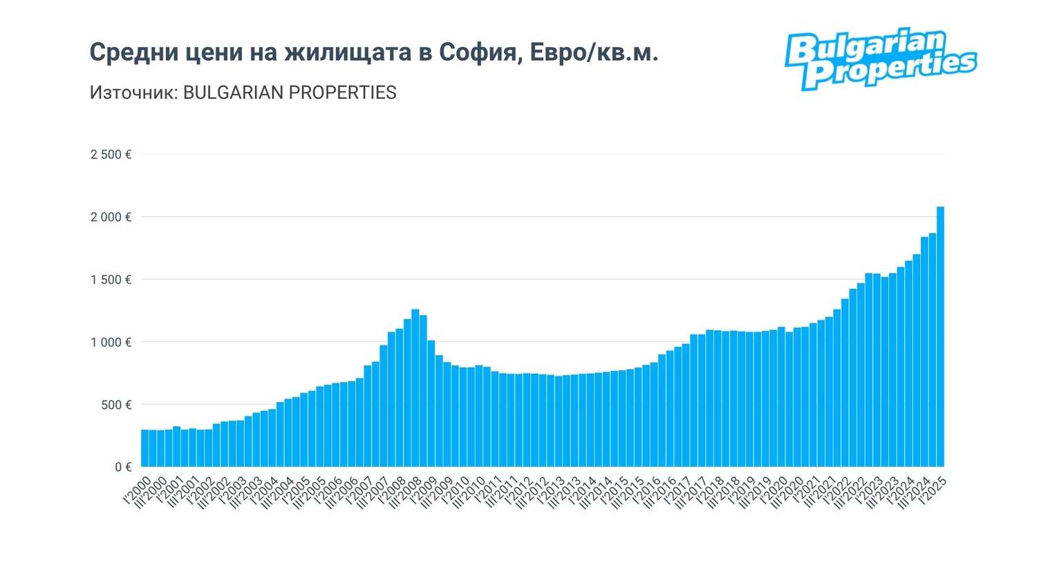 Средната цена на закупените през първото тримесечие на 2025 г. жилища в София достигна 2 080 евро/кв.м., преминавайки символичната граница от 2000 евро. Това представлява 18.1% ръст на годишна база.
