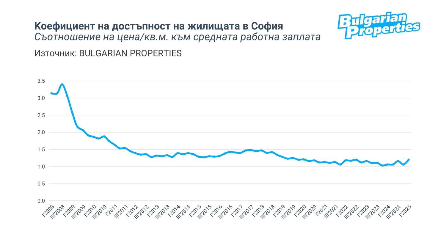 Стойността на коефициента на достъпност на BULGARIAN PROPERTIES към първото тримесечие е 1.20, което показва влошаване на достъпността и връщане на нивата от края на 2022 г. в разгара на инфлацията. Все пак, достъпността остава на средното ниво, около което се движи в годините след голямата финансова криза.