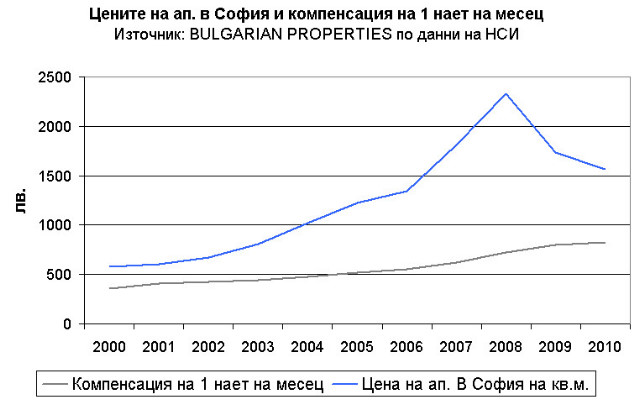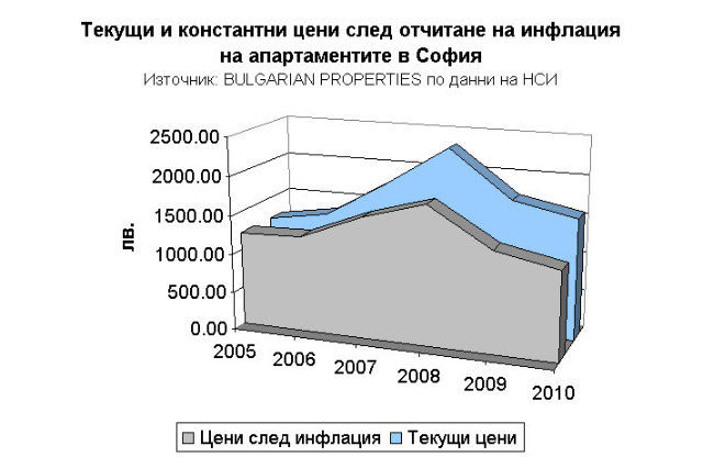 Анализ на BULGARIAN PROPERTIES по данни на НСИ за цените на апартаментите в София след приспадане на инфлацията се получава, че през 2010 г. цените на апартаментите в столицата са се върнали на нива малко под нивата от 2005. Същевременно, доходите на населението на база компенсация на 1 нает през 2010 г. след приспадане на инфлацията са с около 65% по-високи от тези през 2005 г. Т.е. апартаментите в София сега са много по-достъпни за местните купувачи, отколкото през 2005 г.