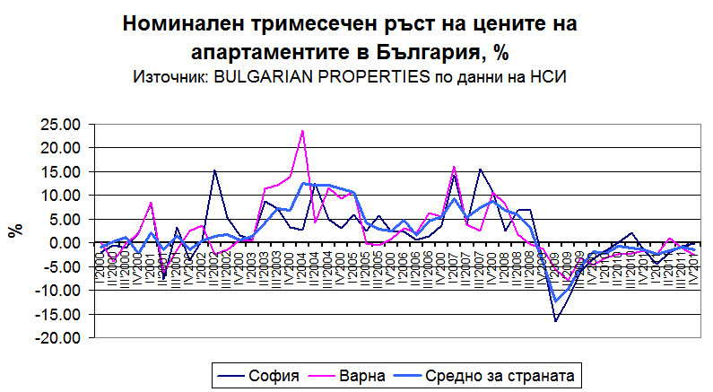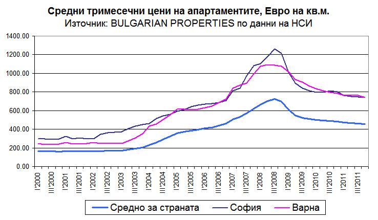 За София номиналният спад на цените през 4-тото тримесечие на 2011 г. е -0.22% спрямо предходното тримесечие и -7.2% на годишна база. След отчитане на инфлация (чрез ХИПЦ) цените на апартаментите в София са спаднали с -0.65% спрямо предходното тримесечие и с -9.5% спрямо същия период на миналата година.