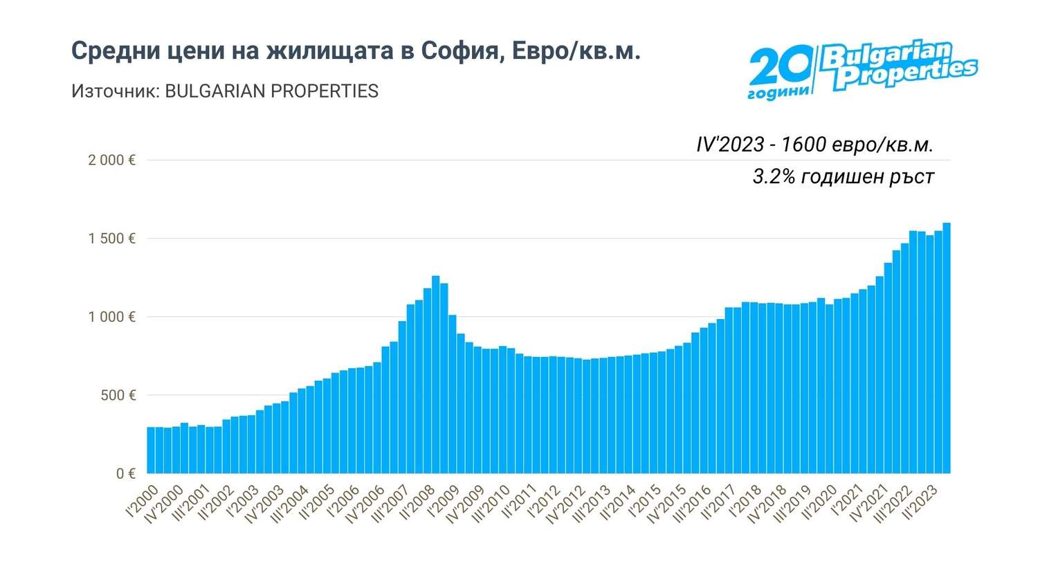 Миналата година средната цена, на която са се сключвали сделките в София, е достигнала 1600 евро на кв. м., сочат данните на BULGARIAN PROPERTIES. Към края на годината покачването на цените на жилищата се е забавило до 3,2% на годишна база, а в реалнo изражениe, след изключване на инфлацията, през последните две тримесечия на 2023 г. е отчетен дори лек спад. При новото строителство повишаването на цените на жилищата в началото на 2024 г. е с между 3% и 10% в зависимост от напредъка на строителството.