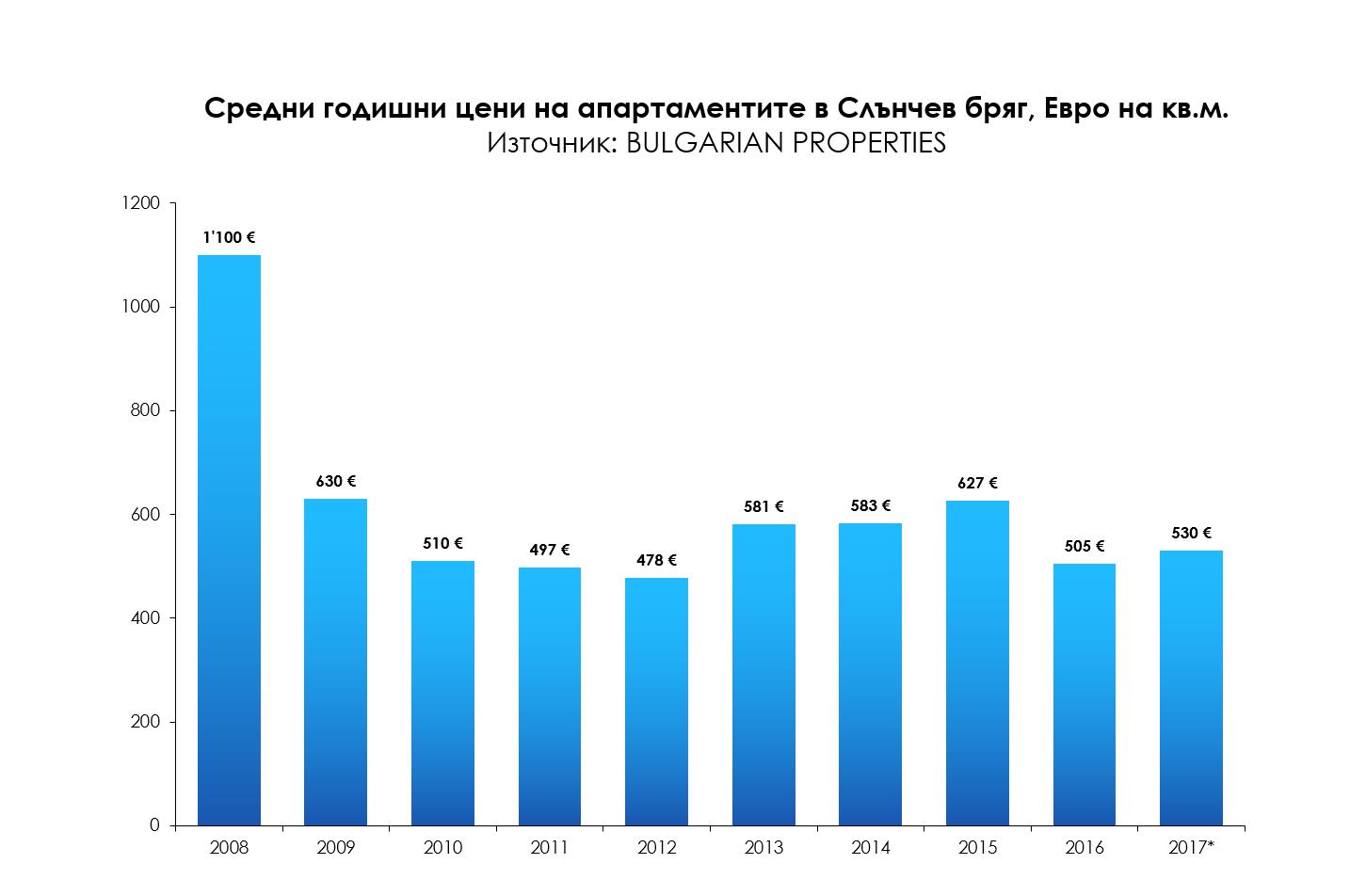 Средната цена, на която се реализират сделки в Слънчев бряг и през първото, и през второто тримесечие на 2017 г. е 530 евро/кв.м. при 505 евро/кв.м. за 2016 г. Общата покупна цена на апартаментите в Слънчев бряг през тази година също е без съществено изменение – 32 200 евро през 2017 при 29 200 евро година по-рано. Цените на имотите във висок клас тип хотелски комплекси са на нива от 750-800 евро/кв.м.