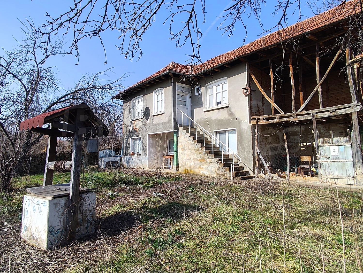 Двор участка имеет правильную прямоугольную форму, окружен каменной стеной, а посередине находится старый колодец с полной водой.