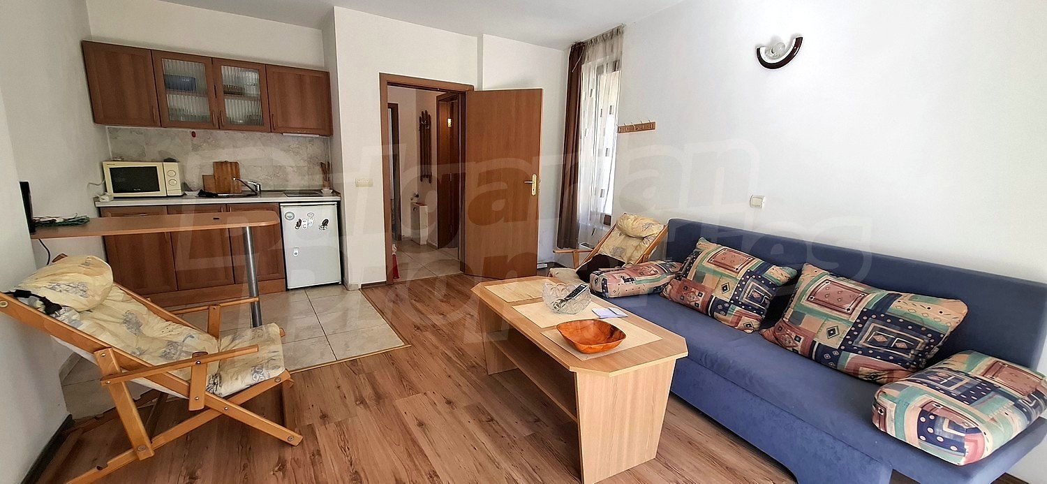 Готовая к заселению квартира с одной отдельной спальней и просторной солнечной гостиной, часть жилого дома вблизи школ, детского сада, автобусной станции, рынка, супермаркета Billa, парка, Старого города Банско. Возможность парковки в районе.
