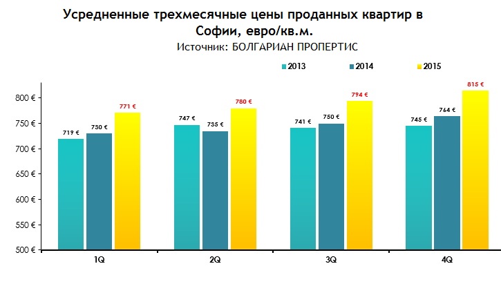 По данным БОЛГАРИАН ПРОПЕРТИС, в 4-м квартале 2015 года средняя стоимость проданных квартир в Софии впервые с 2011 года, превысили 800 евро/кв.м.