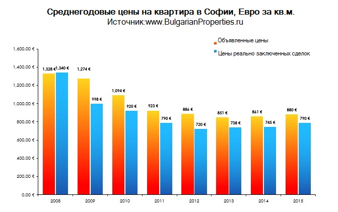 По данным БОЛГАРИАН ПРОПЕРТИС средняя стоимость проданных квартир в Софии в конце 2015 года составила 790 евро/кв.м. при 745 евро/кв.м. в 2014 году, что выразилось в итоге 6%-ным ростом цен. Средняя общая закупочная цена на жилье в столице в 2015 году составила 70 200 евро.