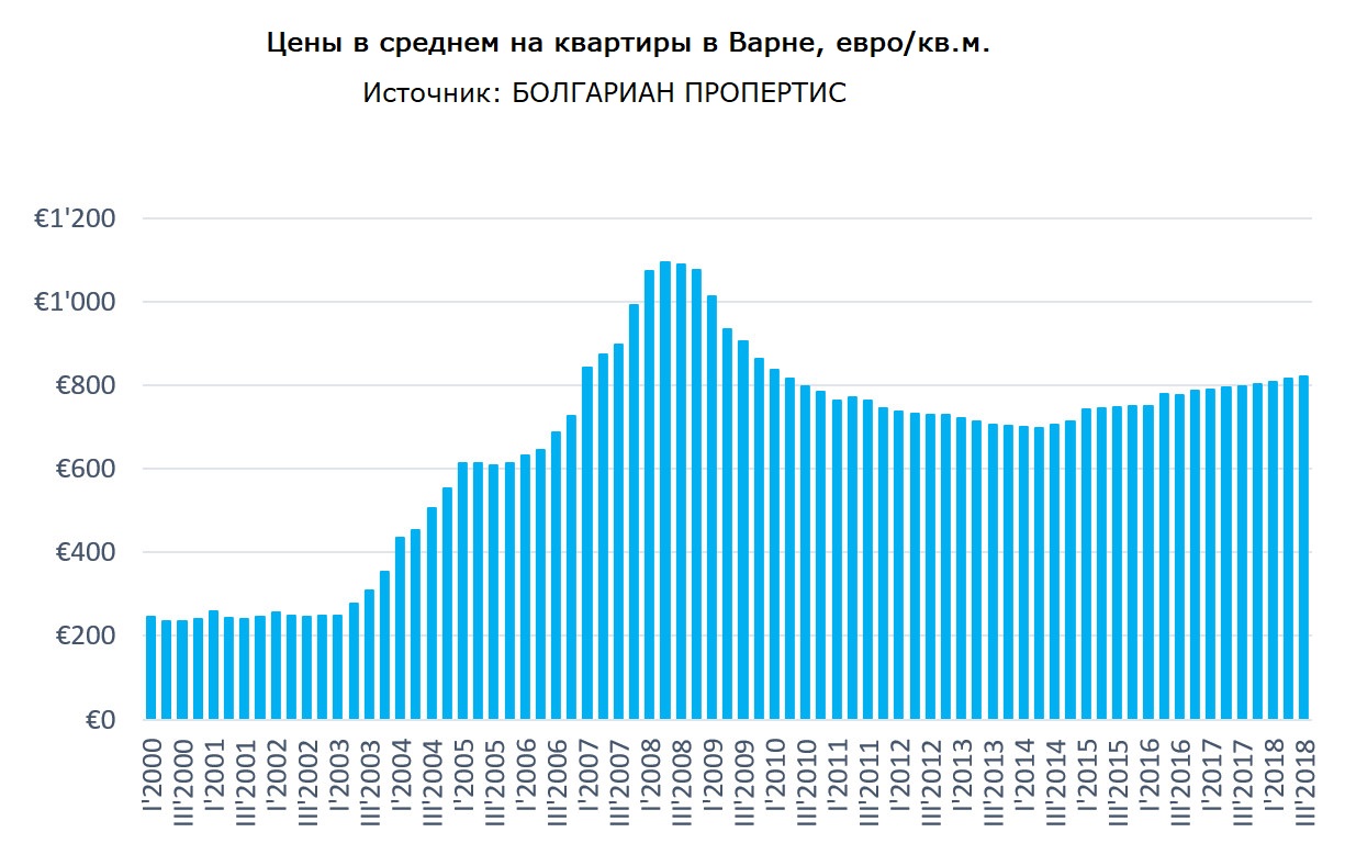 Данные БОЛГАРИАН ПРОПЕРТИС показывают, что средняя цена в Варне в третьем квартале составляет 820 евро/м2. Цены начинаются от 570 евро/м2 в отдаленных районах, таких как Кайсиева градина и Владислав Варненчик, и достигают до 1 800 EUR/м2 в самом центре. Средняя цена в широком центре составляет 800-850 евро/м2.