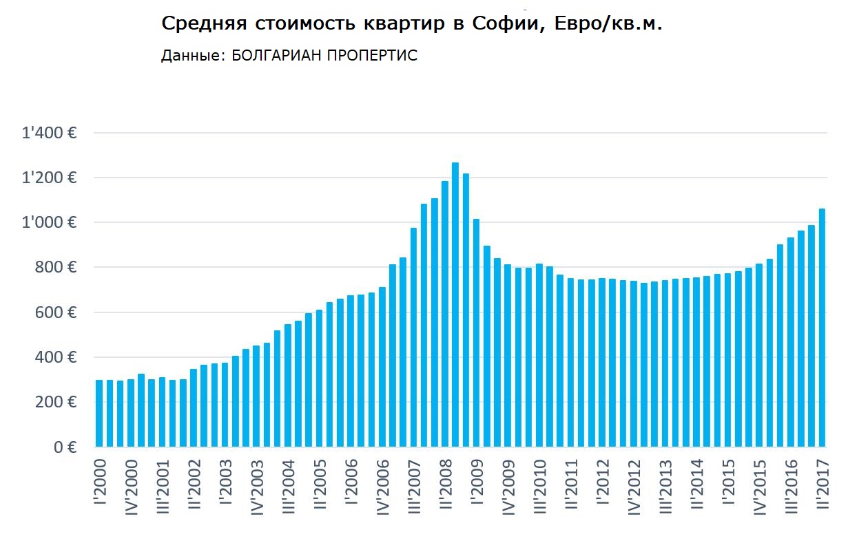На данный момент цены на недвижимость в Софии находятся на уровнях конца 2007 года. До сих пор не достигнуты пиковые показатели 3-го квартала 2008 года., когда средняя цена на жилье в Софии достигла 1260 евро на кв.м.
