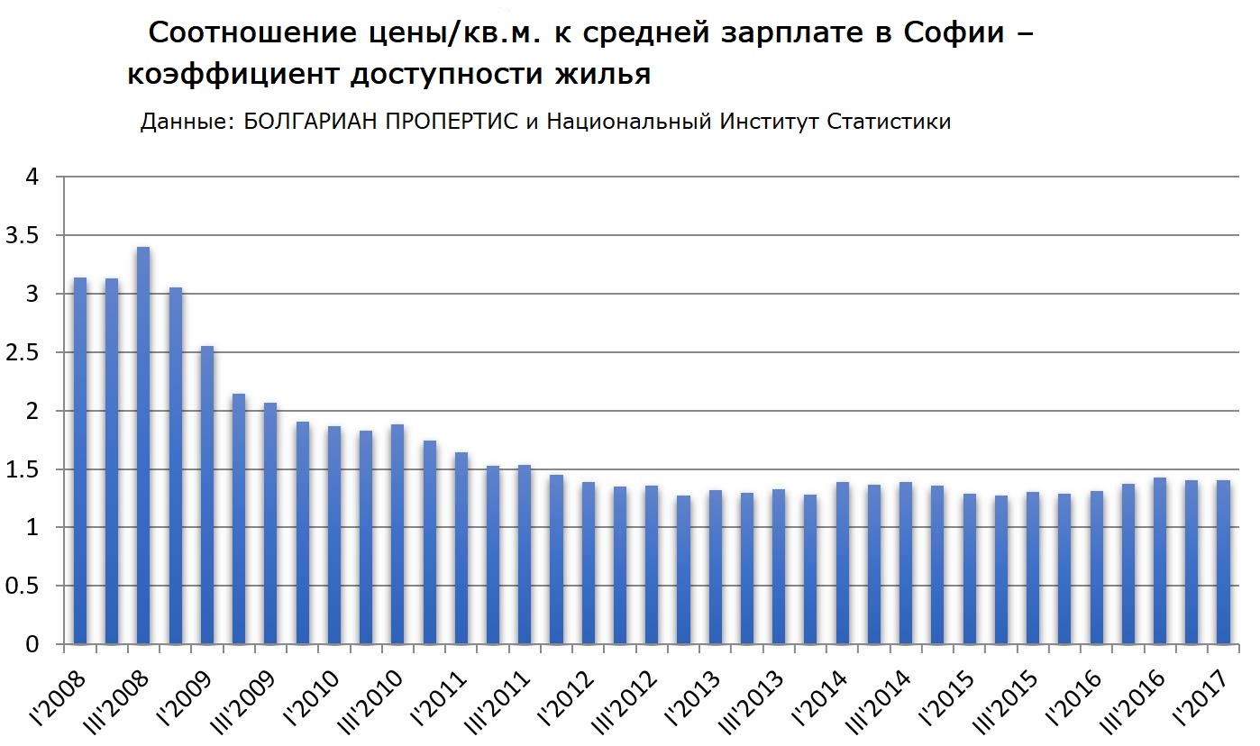 Ускоряется рост ВВП, доходы растут, уровень безработицы остается низким. Доступность жилья, измеряемая нами как соотношение цены за кв.м. в Софии и средней зарплаты для столицы, остается в пределах 1.4, при этом мы отмечаем небольшой рост по сравнению с прошлым годом. Это означает, что доступность уменьшается незначительно, но в целом коэффициент колеблется в границах между 1.3 и 1.4 с 2014 года.