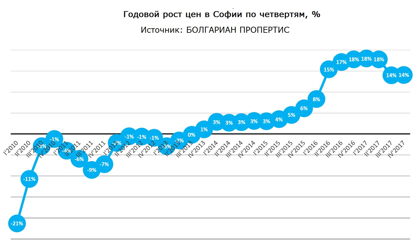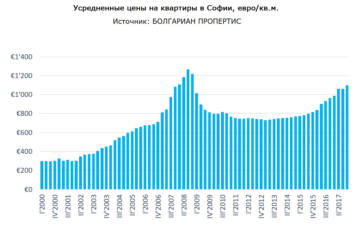 Данные БОЛГАРИАН ПРОПЕРТИС показывают, что в 4-м квартале 2017 года рост цен в Софии возобновился и усредненные цены за метр в Софии выросли до 1 095 евро/кв.м. с 1 060 евро/кв.м. в течение двух предыдущих кварталов. Ежегодное увеличение цен относительно 4-ой четверти 2016 года составляет 14%. Средняя закупочная цена на жилье в Софии составляет 98 780 евро.