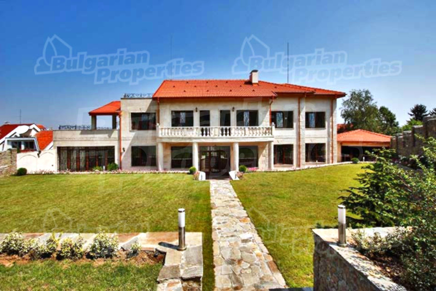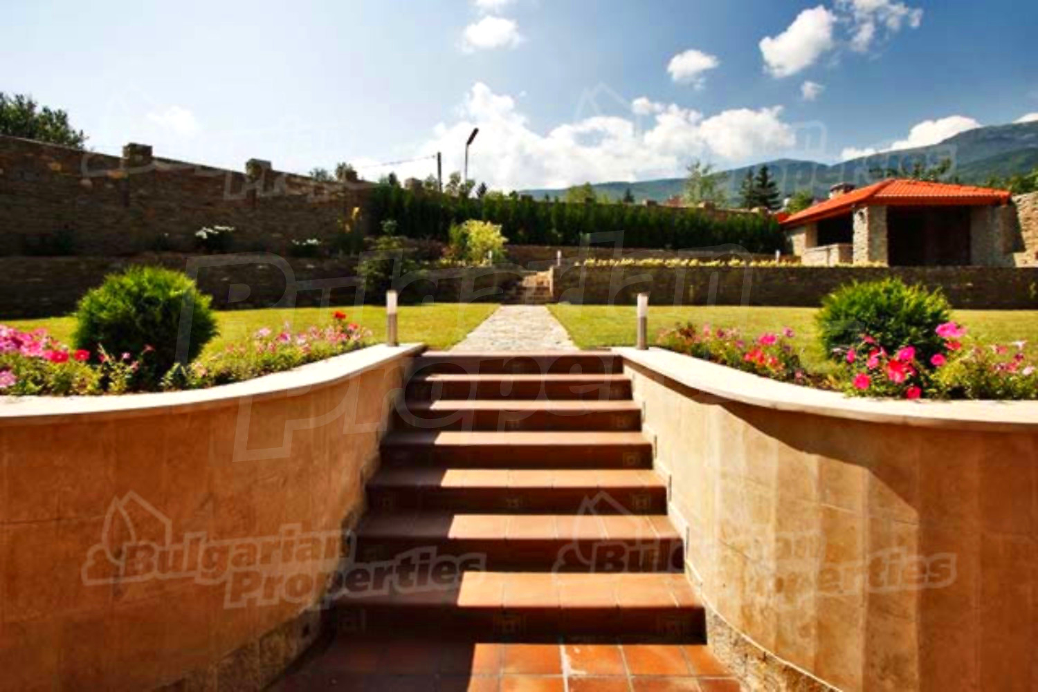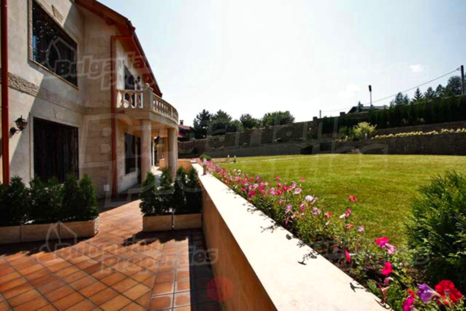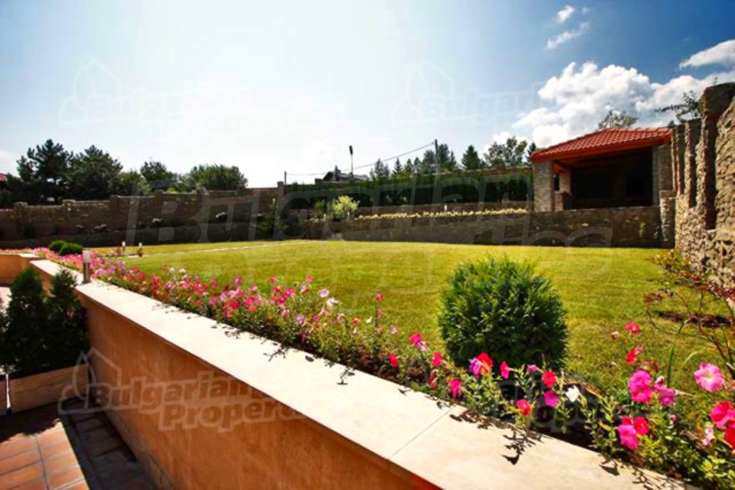 Красиво озелененный двор простирается на площади в 970 кв.м. Во дворе уложена тротуарная плитка с подогревом марки „Klinker”. Имеется также каменная беседка и барбекю, которые оживляют целостную обстановку. Дом огражден массивным каменным забором. Гаражи для трех машин находятся в отдельной подземной постройке с дверями с системой „FAAC”.