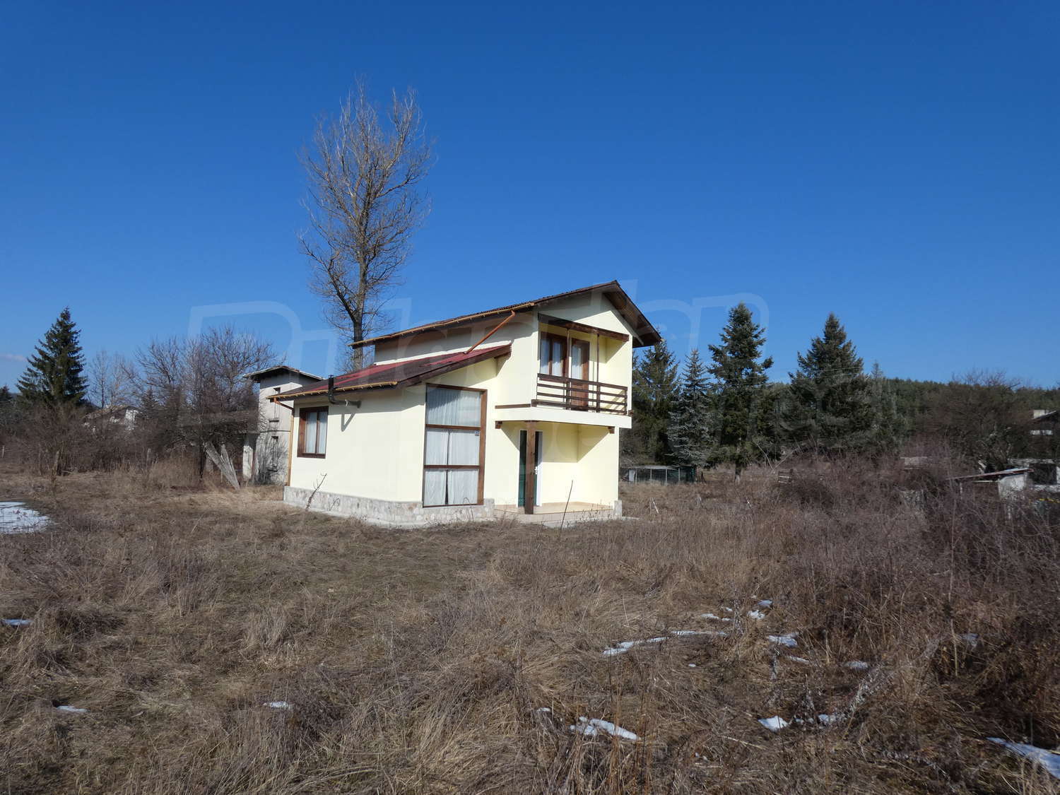 Недавно построенная двухэтажная дача имеет юго-восточное расположение. Площадь виллы – 82.40 кв.м. На первом этаже расположена гостиная, совмещенная с кухней и обеденной зоной, ванная комната с туалетом, прихожая и веранда. На первом этаже на полу – плитка. Деревянная внутренняя лестница ведет ко второму этажу, где расположены две спальни, ванная комната с туалетом и терраса. На полу – высококачественный ламинированный паркет в комнатах и плитка в гостиной и коридоре. Дом продается с мебелью. Кухня полностью оборудованная: керамическая плита, раковина, шкафы, конфорки, духовка, холодильник, стол с шестью стульями. В гостиной есть два дивана и камин. В одной из спален есть двуспальная кровать, две прикроватные тумбочки, стеллажи, а в другой спальне вы найдете две кровати и вешалку. Ванная комната оборудована душевой кабиной, умывальником с зеркалом, туалет, бойлером. Отопление с помощью обогревателя и камина. В доме есть сигнализация. Сад площадью 290 кв.м. с видом на близлежащий лес.
