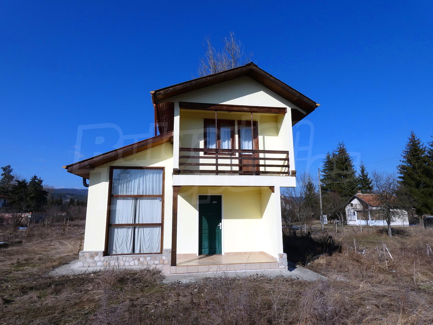 Недавно построенная двухэтажная дача имеет юго-восточное расположение. Площадь виллы – 82.40 кв.м. На первом этаже расположена гостиная, совмещенная с кухней и обеденной зоной, ванная комната с туалетом, прихожая и веранда. На первом этаже на полу – плитка. Деревянная внутренняя лестница ведет ко второму этажу, где расположены две спальни, ванная комната с туалетом и терраса. На полу – высококачественный ламинированный паркет в комнатах и плитка в гостиной и коридоре. Дом продается с мебелью. Кухня полностью оборудованная: керамическая плита, раковина, шкафы, конфорки, духовка, холодильник, стол с шестью стульями. В гостиной есть два дивана и камин. В одной из спален есть двуспальная кровать, две прикроватные тумбочки, стеллажи, а в другой спальне вы найдете две кровати и вешалку. Ванная комната оборудована душевой кабиной, умывальником с зеркалом, туалет, бойлером. Отопление с помощью обогревателя и камина. В доме есть сигнализация. Сад площадью 290 кв.м. с видом на близлежащий лес.