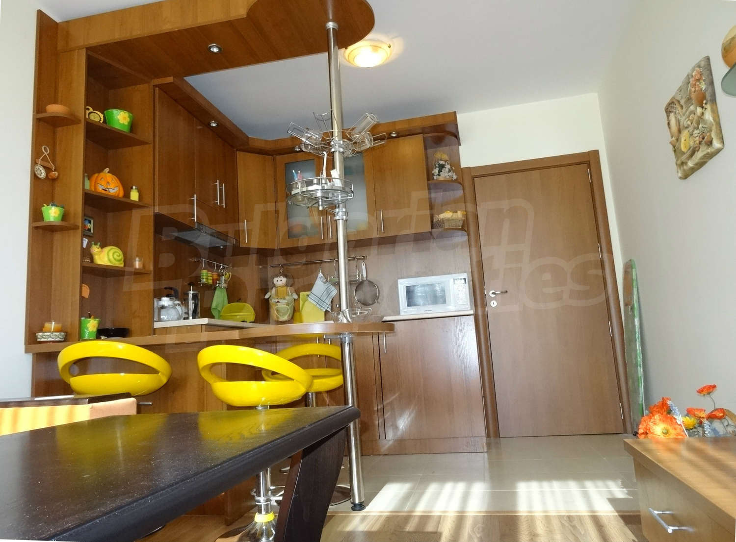Квартира находится на пятом этаже в здании отличного класса. Общая площадь квартиры 72 кв.м. Планировка: вестибюль, гостиная совмещенной с кухни, спальня балкон, ванная комната. Балкон с видом на море.