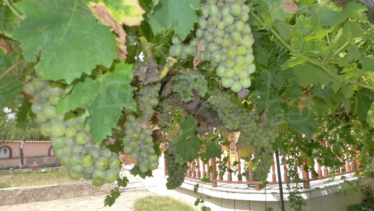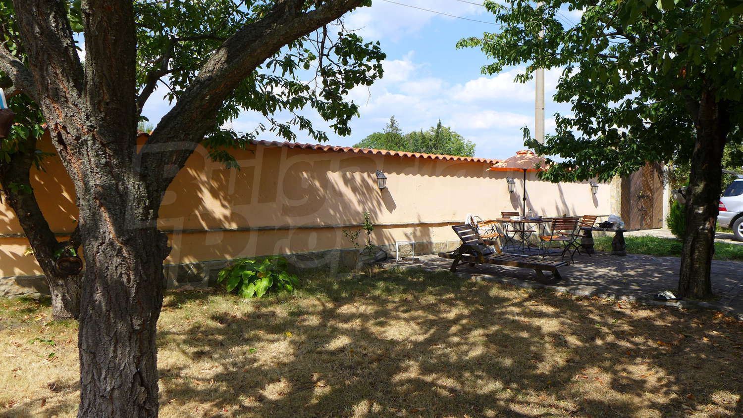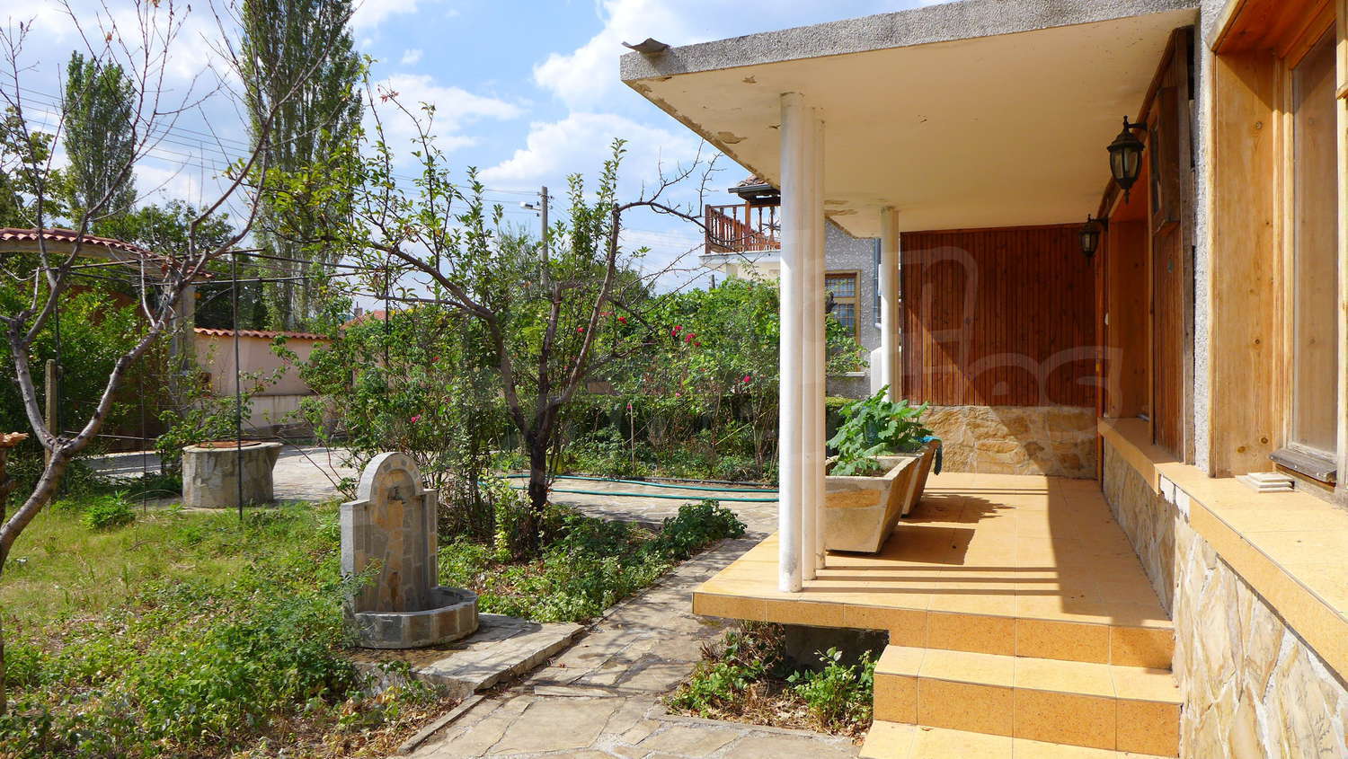 Сад посажены фруктовые деревья. Существует также колодец.