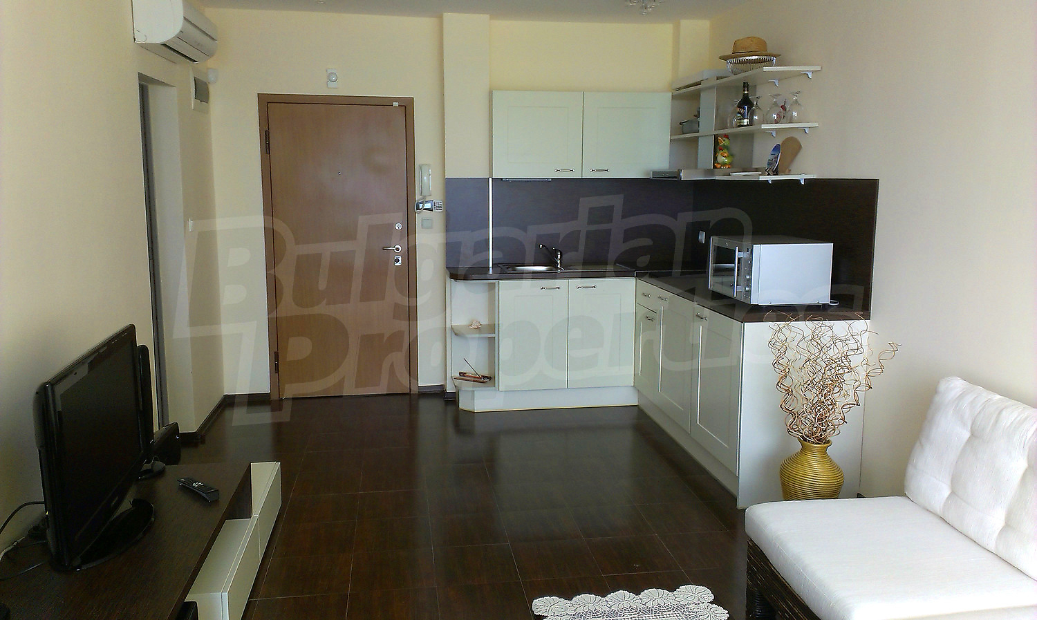 Двухкомнатная квартира площадью 59.75 кв.м. Предлагаемая недвижимость построена в 2007. Отопление кондиционером. Армированная входная дверь, окна пвх, покрашенные стены и терракотовый пол имеются в предлагаемой недвижимости. Недвижимость включает следующую мебель и оборудование: бойлер электрический, встроенная кухня, вытяжка, душевая, кондиционер, мебель, оборудованная ванная комната, посудомоечная машина, телевизор и холодильник. Из основных коммуникаций обеспечены электричество, вода и канализация. Ванная комната с туалетом, обозначенная стоянка, стоянка, терраса, комплекс закрытого типа, консьерж, лифт, заасфальтированная дорога, интернет, кабельное телевидение, система охранной сигнализации и телефон имеются в наличии среди прочих характеристик предлагаемого объекта, что обеспечит дополнительный комфорт для пользования. Виды на город, виды на залив, виды на море и виды на пляж открываются с недвижимости, раскрывая часть красот живописной Болгарии.