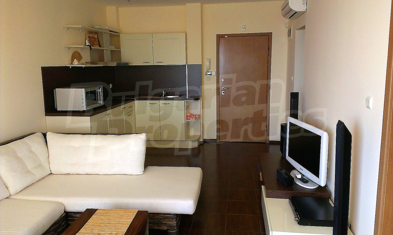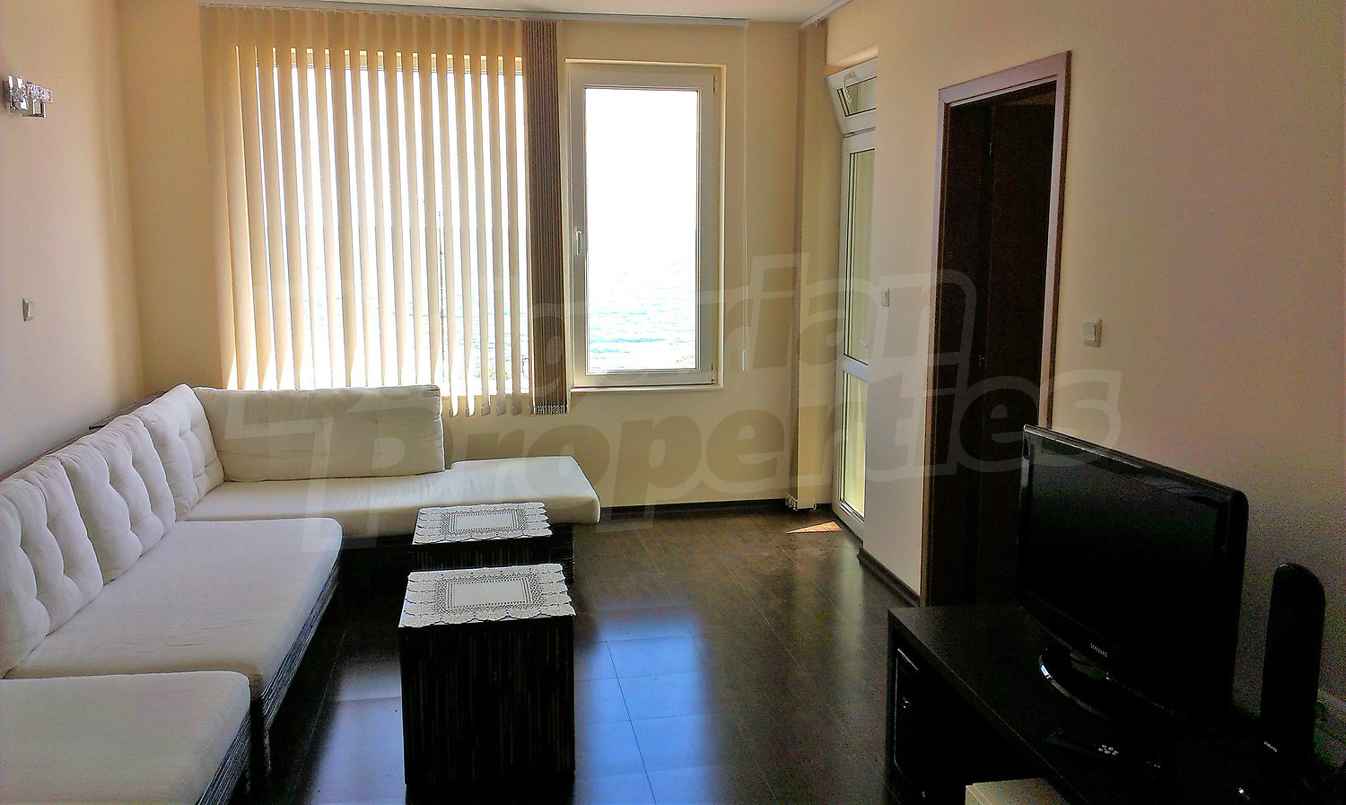 Двухкомнатная квартира площадью 59.75 кв.м. Предлагаемая недвижимость построена в 2007. Отопление кондиционером. Армированная входная дверь, окна пвх, покрашенные стены и терракотовый пол имеются в предлагаемой недвижимости. Недвижимость включает следующую мебель и оборудование: бойлер электрический, встроенная кухня, вытяжка, душевая, кондиционер, мебель, оборудованная ванная комната, посудомоечная машина, телевизор и холодильник. Из основных коммуникаций обеспечены электричество, вода и канализация. Ванная комната с туалетом, обозначенная стоянка, стоянка, терраса, комплекс закрытого типа, консьерж, лифт, заасфальтированная дорога, интернет, кабельное телевидение, система охранной сигнализации и телефон имеются в наличии среди прочих характеристик предлагаемого объекта, что обеспечит дополнительный комфорт для пользования. Виды на город, виды на залив, виды на море и виды на пляж открываются с недвижимости, раскрывая часть красот живописной Болгарии.