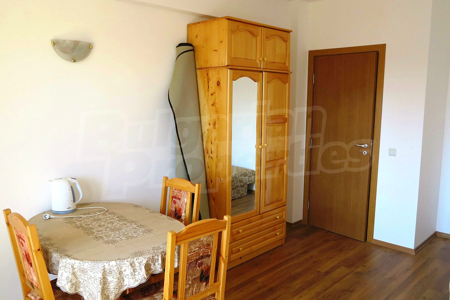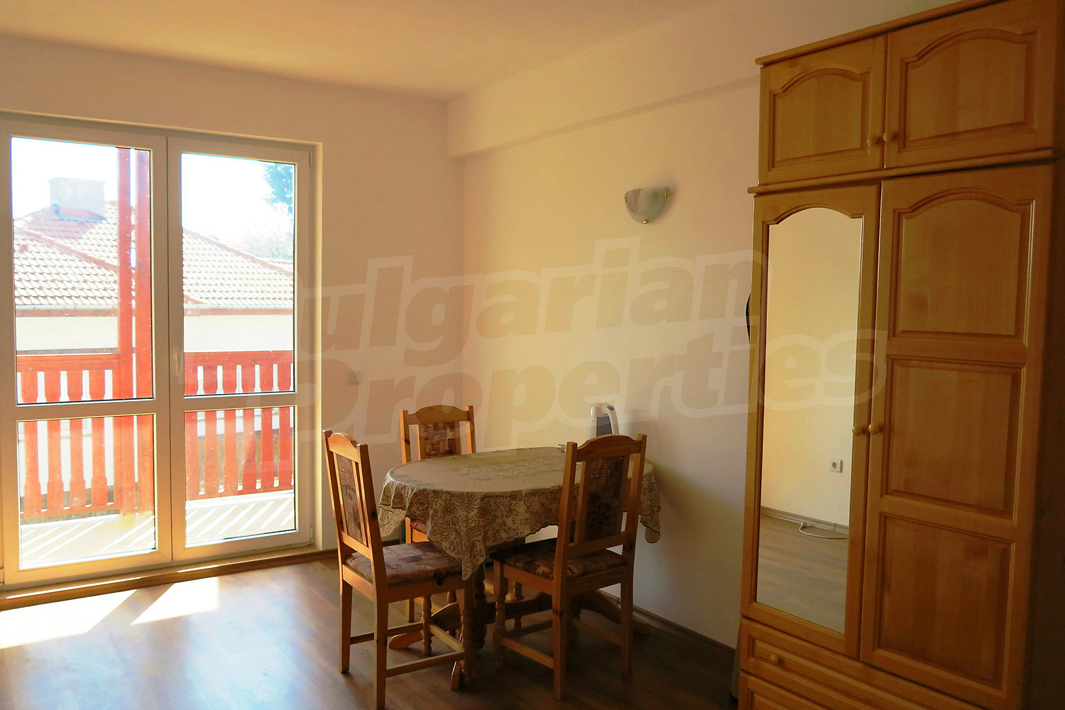 Мебель на данный момент включает: двуспальную кровать, стол, стулья, шкаф - все из натурального дерева, сосна. Имеется к тому же электрическая плитка с духовкой, 2 больших радиатора, которые можно повесить на стену. В отношении оставшейся меблировки, новые владельцы, могут полностью раскрыть свои идеи о дизайне интерьера, дополнив всем необходимым и бытовой техникой. Ванная комната с ванной. Балкон с прекрасным видом на горы Рила, леса и окрестности.